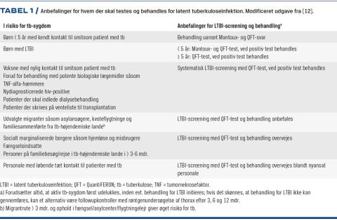 Man bør nøje overveje, hvad indikationen er for at screene for LTBI. Hvilke konsekvenser vil et positivt eller negativt testresultat få for den enkelte patient? Har man mistanke om aktiv tb-sygdom, anbefales brug af QFT som udgangspunkt ikke, da man som nævnt ikke kan skelne mellem LTBI og aktiv tb med testen [12], men den kan have sin plads i tb-udredning af børn [24]. Hvem skal vi så teste? WHO anbefaler systematisk screening af børn og voksne, som er kontakter til patienter med aktiv tb-sygdom, nydiagnosticerede hiv-positive personer, patienter, der skal behandles med biologiske lægemidler, patienter, der skal i dialyse, og patienter, der skal forberedes til transplantation [25]. Derudover anbefaler WHO, at man overvejer screening blandt fængselsindsatte, sundhedspersonale, migranter fra tb-højincidenslande samt socialt udsatte såsom hjemløse og stofmisbrugere [25]. De nyeste danske guidelines [12] følger i store træk disse WHO-anbefalinger (Tabel 1), men der findes ingen opgørelser over, om anbefalingerne er implementeret i klinisk praksis. En igangværende opgørelse i Aarhus har vist, at et stort antal hiv-smittede ikke er screenede eller tilbudt forebyggende behandling, og der foreligger ingen opgørelser over, om hospitalsansatte på relevante afdelinger er screenede som anbefalet af WHO. Det er for nuværende ikke praksis i Danmark systematisk at teste og behandle fængselsindsatte eller andre socialt udsatte grupper i samfundet, men der er et igangværende studie af screening for LTBI og profylaktisk behandling af socialt udsatte i Danmark. Ligeledes undersøges det p.t., hvilke immigranter der er i størst risiko for at udvikle aktiv tb, og derfor vil have gavn af systematisk screening og profylaktisk behandling ved ankomsten til Danmark [26]. Da immigranter har en høj risiko for tb mange år efter ankomsten, kan LTBI-behandling af dem være en vigtigt del af arbejdet med at sænke tb-forekomsten [27].