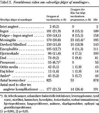 Det, som synes at have betydning for valg eller fravalg af vaccinen, er indstillingen til komplikationer til vaccinen. Det er derfor vigtigt, at man i informationen til forældrene oplyser om de sandsynlige bivirkninger ved vaccinen og holder dem op mod komplikationerne til selve sygdommene. Det, som kan virke overraskende i svarene om bivirkninger ved vaccinen, er, at ca. en fjerdedel i gruppe B angav ændret adfærd (herunder autisme) som bivirkning, hvilket der ikke er videnskabeligt belæg for (6-8), mens motoriske forstyrrelser, som synes sandsynlige, oftest i form af forbigående ataksi (9), kun blev angivet af 6%.