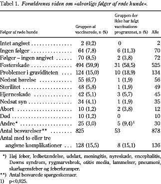 Med hensyn til røde hunde synes der at være en generel viden om, at sygdommen under graviditet kan skade fostret (60%), medtager man i denne gruppe også besvarelserne »problemer i graviditeten«, giver det 75%, hvilket dog stadig er lavere end i en tidligere dansk undersøgelse blandt forældre, der havde afstået fra MFR-vaccination (96%) (1). Dette kan skyldes, at spørgsmålene var åbne i denne undersøgelse, hvorimod der i undersøgelsen fra 1991 var opstillet nogle valgmuligheder. Desuden foregik der i de første år af vaccinationsprogrammet en større oplysningskampagne i radio og tv.