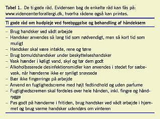 I vurderingen blev der lagt vægt på følgende behandlingsstrategier: Lokalsteroider er førstevalgspræparat til behandling af håndeksem. Styrken af lokalsteroid vælges ud fra hensigten om en hurtigt indsættende og effektiv behandling rettet mod at gøre patienten symptomfri, og generelt skal håndeksem behandles med stærkt virkende lokalsteroid (gruppe III) 1-2 gange dagligt i 2-3 uger, hvorefter frekvensen af applikationer nedtrappes, alternativt skiftes til et præparat med en reduceret styrke. Ved lettere inficerede eksemer kan der være indikation for at benytte kombinationspræparater i form af lokalsteroid suppleret med en antibiotisk komponent. Hudbeskyttende foranstaltninger er et vigtigt aspekt, som indbefatter bl.a. anvendelse af beskyttelseshandsker og fugtighedscreme samt minimering af håndvask [10, 12-15]. De generelle beskyttelsesforanstaltninger findes opsummeret i form af »De ti gode råd« (Tabel 1). Evidensen bag de enkelte råd kan findes på Videncenter for Allergis hjemmeside: www.videncenterforallergi.dk, hvorfra rådene også kan printes. Ifølge Referenceprogram om kontakteksem bør patienter med kontakteksem på hænderne af mere end en måneds varighed henvises til en speciallæge til ætiologisk udredning [10].