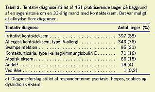 Materiale: I alt 700 tilfældigt udvalgte praktiserende læger fik tilsendt et spørgeskema. Spørgeskemaets centrale del var struktureret som en sygehistorie omhandlende et eksempel på erhvervsudløst kontakteksem af fire måneders varighed på hænder og arme. Ud fra de opstillede svarkategorier skulle lægerne stille en tentativ diagnose, ordinere en behandling, rådgive patienten og tage stilling til viderehenvisning.