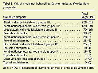 I alt 420 (93%) af lægerne skønnede, at der var indikation for at sætte patienten i medicinsk behandling med det samme. Stærkt virkende lokalsteroid (gruppe III) var det fortrukne behandlingsmiddel, som 228 (51%) ville benytte, mens 128 (28%) valgte et kombinationspræparat med gruppe III-lokalsteroid og et antibakterielt stof. I alt 319 (71%) havde valgt et eller begge af denne type præparater. Et middelstærkt virkende lokalsteroid (gruppe II) blev valgt af 70 (16%) (Tabel 3). De læger, som valgte topikal antimykotisk behandling, havde alle vurderet, at der kunne være tale om en svampeinfektion.
