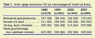I alt 229 af 394 (58%) svarede rigtigt på spørgsmålet om, hvorvidt man som 16-årig kan få foretaget en fri abort uden forældrenes kendskab. Kønsfordelingen var anderledes, da 61% af drengene og blot 44% af pigerne kendte svaret (p < 0,26). Blandt de debuterede var forskellen udlignet, da tallene her var 55% og 56% for hhv. drengene og pigerne. Fra 56% i 1986 var andelen af rigtige besvarelser på spørgsmålet om forældrenes inddragelse ved provokerede aborter hos mindreårige steget til 68% i 1993 for hele populationen. Andelen holdt sig stabil frem til 2000, hvor 64% angav det rigtige svar (2000 vs. 2007, p < 0,25). Som anført er tallet i 2007 58%, hvorved kendskabet til spørgsmålet er tilbage på 1986-niveau (Tabel 1).