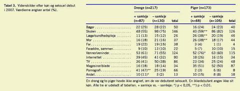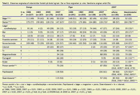 Den vigtigste kilde til viden angives af begge køn som forventet at være skolen, men der er sket et betydeligt skift til brug af skærmmedier (tv/internettet) og magasiner/pornoblade (Tabel 2). Mest overraskende var det, at 50% af pigerne angav magasiner som kilde til viden, mens pendanten hos drengene (pornografi + magasiner) kun blev angivet af ca. 40%. Parallelt med dette er bøgernes og lægens/sundhedsplejerskens andel faldende, mens forældrene samlet står for en signifikant, men lille stigning. Venner og veninders andel i opbygningen af seksuel viden er velkendt høj og det for begge køn. En reel kønsforskel var, at lægen, mor og magasiner fortsat spillede en større rolle for piger end for drenge, mens pornografi, tv, internet og far var mere brugt hos drengene. Hvis man opdeler videnskilder i personer (mor, far, forældre, venner, veninder, læger, sundhedsplejerske, skolen), skærmbaserede kilder (tv, internet) og papirbaserede kilder (bøger, magasiner, pornografi) ses, at drenge i mindre omfang trak på personer og i højere omfang anvendte skærmbaserede kilder. For de skærmbaserede kilder var der derudover forskel på, om man var debuteret seksuelt eller ej (53% vs. 38%). Igen var der en signifikant overvægt af drenge i begge kategorier (Tabel 2 og Tabel 3). For personbaserede kilder var der en lille overvægt af drenge i forhold til piger blandt de seksuelt erfarne. For de papirbaserede medier var det blandt ikkedebutanter pigerne, der overvejende drog nytte heraf i forhold til drengene.