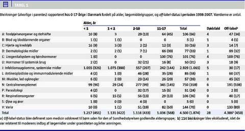 I perioden 1998-2007 blev der i Danmark indsendt 2.437 bivirkningsrapporter om 4.500 bivirkninger hos 0-17-årige. Læger rapporterede langt den største del af bivirkningerne (89%) [13]. Tabel 1 viser fordelingen af bivirkningerne på alder, terapeutiske grupper, alvorlighed og off-label -status. I alt blev 42% af bivirkningerne klassificeret som værende alvorlige. En femtedel af bivirkningerne var relateret til off-label -ordinationer, og 60% af disse var alvorlige [14]. Der blev anmeldt 28 dødsfald relateret til medicinbrug hos børn og unge, både for lægemidler, der var godkendt til børn, og for lægemidler, der blev anvendt off-label [13, 14]. Fordelingen af dødsfald på terapeutiske grupper er angivet i Tabel 1. De fleste dødsfald var rapporteret for psykofarmaka (ATC-gruppe N) [15] og infektionsmidler til systemisk brug (ATC-gruppe J) [16]. To dødsfald hos 0-årige var formodet relateret til mødrenes brug af citalopram og fluoxetin under graviditeten [15]. To dødsfald var anmeldt for børnevacciner: Det ene var rapporteret hos en 0-årig for Di-Te-Ki-Pol/Act-Hib-vaccinen, det andet var rapporteret hos en 12-årig pige som følge af immunisering med MFR-vaccinen [16, 17].
