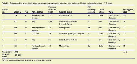Halvtreds patienter med øsofagusperforation blev henvist til Thoraxkirurgisk Afdeling, Gentofte Hospital, over en syvårig periode, primært fra andre kirurgiske afdelinger uden toraxkirurgisk ekspertise. I den sidste del af denne periode opnåede man videotorakoskopisk ekspertise og behandlede seks patienter videotorakoskopisk med spaltning af mediastinum (mediastinotomi), débridement og drænage. Det følgende omhandler kun operationsforløbet for disse seks patienter.