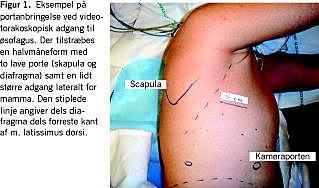Torakoskopien blev udført med 30 graders sidekiggende skop (5 mm eller 10 mm) (Olympus) gennem 5-10-mm-incisioner. 2-3 andre porte blev placeret, afhængig af det område der skulle arbejdes med, men gerne en over diafragma, en under skapula og en tredje port lateralt for mamma (Figur 1 ). Mediastinum blev spaltet helt, fra cupula til den diafragmale overgang. Derefter foretog man débridement, evt. øsofagorafi og skylning med saltvand, hvorefter der blev anlagt tre dræn (det ene ind til perforationen i mediastinum, et apikalt og et langs diafragma).