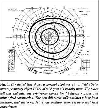Ved kinetisk Goldmann-perimetri blev der generelt opnået mere jævne indrykninger af synsfeltydergrænser, med stor praktisk reproducerbarhed i forløbet af den enkelte undersøgelse (retestning i tidligere bedømt meridian) og ved gentagen undersøgelse (kun lille indlæringseffekt). Med hovedvægten lagt på testværdierne omkring horisontalplanet valgte vi under henvisning til erfaringer fra litteraturen (17-20) arbitrært ud fra Fig. 1 at rubricere de individuelt bestemte grænser, som hhv. normale, let påvirkede, med middel påvirkning eller - længst inde - med svær restriktion.