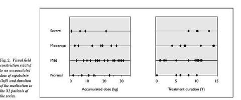 Fig. 2 viser den påviste synsfeltpåvirkning sat i relation til akkumuleret vigabatrindosering og til behandlingsvarighed. Synsfeltpåvirkningen viste statistisk signifikant sammenhæng med den kumulerede dosis (p = 0,035, SAS program, Kendalls tau), mens korrelationen med behandlingsvarighed kun var tæt på (p = 0,056) Det bemærkes, at begyndende synsfeltpåvirkning hos enkelte kunne registreres efter kun et års behandling. Korrelationen til dagsdosis' størrelse var ikke signifikant (p = 0,434, Kendalls tau).