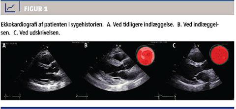 mien var velkontrolleret og forløbet relativt mildt. En antistofundersøgelse viste ikke tilstedeværelse af immunglobulin M for Borrelia, Mycoplasma, Chlamydia, Bartonella, adenovirus og cytomegalovirus. Efter otte dages indlæggelse blev patienten udskrevet i habitualtilstand. EKKO foretaget før udskrivelsen viste nærnormalisering med reduktion i vægtykkelsen af venstre ventrikel fra 15 mm til 11 mm og stigning i uddrivningsfraktion fra 30% til 50% (Figur 1). Der blev planlagt ambulant opfølgning ved reumatolog, egen læge og kardiologisk i form af EKKO tre måneder efter udskrivelsen. Patienten var ikke indlagt i den mellemliggende periode.