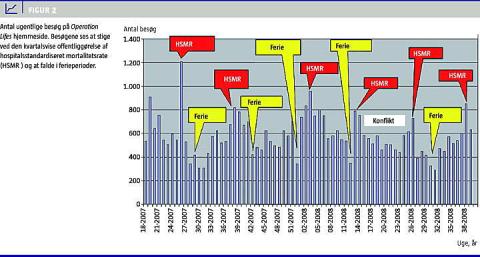 Regioner og sygehuse kan bruge egne HSMR-værdier til at evaluere effekten af lokale aktiviteter over tid, og der ses i forbindelse med den kvartalsvise offentliggørelse af HSMR et øget antal besøg på kampagnens hjemmeside samt opmærksomhed i dagspressen (Figur 2 ).