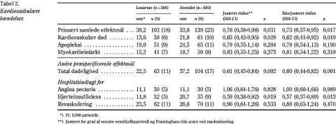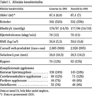 Resultater: Blodtrykket blev reduceret til 146/79 mmHg og 148/79 mmHg på henholdsvis losartan- og atenololbehandling. Det primære sammensatte effektmål blev registreret hos 103 patienter i losartangruppen (n = 586) og hos 139 i atenololgruppen (n = 609), relativ risikoreduktion 24% (p < 0,031). Kardiovaskulær død blev reduceret med 37% (p = 0,028) og total død blev reduceret med 39% (p = 0,002)