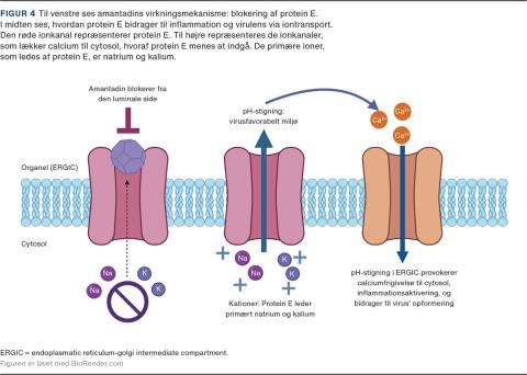 På cellulært niveau ses ved knockout af protein E en reduktion i inflammasomaktivering og inflammationsmarkørerne IL-1β og NF-κβ, som har betydning for virulens, inflammation og dermed sygdomsbyrde [21, 22]. Det er ved SARS-CoV-1 påvist in vitro og i mus, at amantadin binder til den transmembrane alfahelixregion af protein E og blokerer denne effektivt [8, 23, 24]. Med udgangspunkt i den store sekventielle lighed mellem protein E i SARS-CoV-1 og SARS-CoV-2 er det derfor blevet undersøgt, om interaktionen var tilsvarende i SARS-CoV-2. Ved analyse af binding, ionkonduktans og 3D-strukturfremstilling er det blevet vist, at amantadin også her binder, interagerer og blokerer protein E effektivt(Figur 4) [21]. Vores hypotese er derfor, at targetering og inhibition af protein E i SARS-CoV-2 hos mennesker vil kunne begrænse sygdomsprogression [6, 20, 21, 22]. Dette er understøttet af antivirale studier i celler, hvor amantadin blokerer SARS-CoV-2-replikation [25, 26]. Amantadins søsterstof, rimantadin, der betragtes som mindre toksisk og har udvist god effekt mod SARS-CoV-2 i in vitro-studier, blokerer ikke viroporiner i SARS-CoV-2, og er derfor ikke undersøgt in vivo [6].