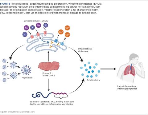 Protein E danner et alfahelikalt transmembrant protein af fem monomerer – en pentamer – som danner selve poren, der bl.a. indsættes i endoplasmatic reticulum-golgi intermediate compartment (ERGIC). Herigennem kan natrium og kalium passere og bidrage til et virusfavorabelt miljø og til inflammation (Figur 3) [6, 18].