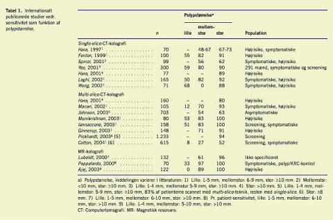 Tabel 1 viser et uddrag af internationalt publicerede resultater vedr. sensitivitet for hhv. CTK og MRK i sammenligning med koloskopi. I hovedparten af studierne fungerer koloskopi som guldstandard, mens man i enkelte studier har taget hensyn til, at koloskopi heller ikke er fuldkommen [3-6].