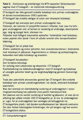 Anbefalingerne vedr. indikationen for CTK fra MTV-rapporten Tyktarmsundersøgelse med CT kolografi - en medicinsk teknologivurdering fremgår af Tabel 2 , og vil formentlig problemfrit kunne gælde for MRK, når større erfaring med denne undersøgelse opnås. Som det fremgår, udgør CTK et supplement til koloskopi, og CTK vil blive den undersøgelse, der erstatter røntgen af colon.