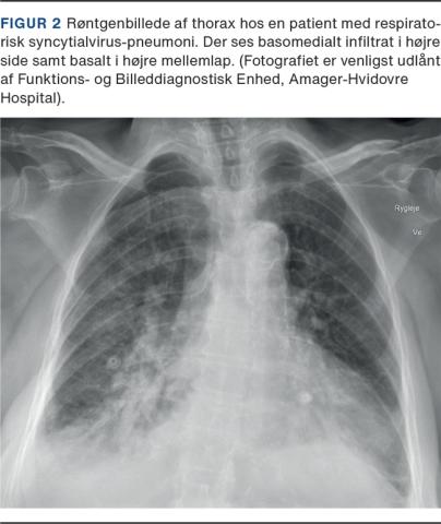 RSV er den hyppigste årsag til pneumoni og bronchiolitis hos børn under fem år [11] og kan blandt voksne med pneumoni påvises i 2-5% af tilfældene [1, 12]. RSV forekommer hyppigst hos patienter over 65 år med underliggende komorbiditet med symptomer såsom hoste, ekspektoration, dyspnø, muskelømhed og feber [13]. 30-70% af patienterne har radiologisk påviste forandringer med infiltrationer, hvoraf unilaterale matglasforandringer og konsolidering er de hyppigste fund Figur 2 [14]. Ældre patienter med komorbiditet er i risiko for at få respirationssvigt, idet en tredjedel får brug for respiratorbehandling, og dødeligheden hos voksne er fundet at være op mod 15% [12].