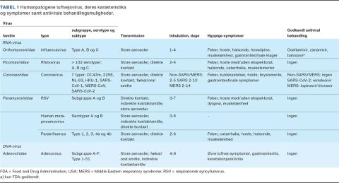 Mindre present i diagnostik og behandling af pneumoni er de mere almindelige virus, selvom studier viser, at disse forekommer hyppigt blandt immunkompetente patienter [1, 2]. Trods et overordnet lavt diagnostisk udbytte med fund af patogen i under halvdelen af tilfældene viser det sig i en metaanalyse fra 2016, at virus er involveret i op mod 23% af alle pneumonier. De hyppigste af disse virus er: influenzavirus, humant rhinovirus (HRV), coronavirus og respiratorisk syncytialvirus (RSV). I det nedre spektrum finder man human metapneumovirus, parainfluenzavirus og adenovirus [1]. Virus og deres karakteristika er angivet i Tabel 1. I det følgende vil litteraturen på de tre hyppigste noninfluenzaårsager til viruspneumoni blive gennemgået.