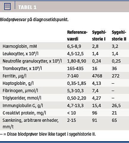 I. En tidligere rask, toårig pige blev henvist på mistanke om akut leukæmi efter seks måneders catarrhalia, tre måneders hoste, svingende febrilia og den seneste måned med nattefeber og -sved. Dog havde hun været i velbefindende i dagtiden og været i vuggestue helt frem til indlæggelsen. Hun var febril, bleg, takykard og havde en ultralydverificeret splenomegali med en længde på 12 cm, men ingen lymfadenopati eller hepatomegali. Paraklinisk var hun pancytopenisk, og det perifere udstryg viste ingen blaster. Supplerende blodprøver viste svært forhøjede niveauer af ferritin, haptoglobin, triglycerider og immunglobulin G, hvilket er foreneligt med HLH (Tabel 1).