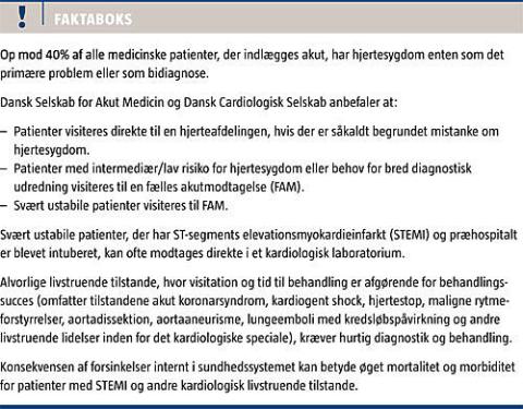 Op mod 40% af alle medicinske patienter, der indlægges akut, har hjertesygdom enten som det primære problem eller som bidiagnose. En del af disse hjertepatienter har alvorlige livstruende tilstande, hvor visitation og tid til behandling er afgørende for behandlingssucces. Dødeligheden efter førstegangstilfælde af akut myokardieinfarkt er faldet gradvist gennem de seneste 25 år [2], hvilket med stor sikkerhed kan tilskrives en forbedret organisering af indlæggelsesforløbet samt en forbedret indsats med hensyn til både medicinsk og invasiv behandling [3, 4]. Indførelsen af FAM (flere steder kaldet akutafdeling) foregår forskelligt rundt om i landet; formålet er at styrke kvaliteten i modtagelsen af den akutte patient med blandt andet systematiseret triage , overvågningsmuligheder og styrkelse af lægelige kompetencer. Det gælder dog fortsat, at visse veldefinerede patientforløb bør visiteres direkte til specialiseret behandling. Konsekvensen af forsinkelser internt i sundhedssystemet kan være fatal for patienter med ST-segments elevationsmyokardieinfarkt (STEMI), der skal have udført primær perkutan koronarintervention (PCI) af den lukkede/forsnævrede hjertekranspulsåre [5]. Formålet med nærværende statusartikel er at give en redegørelse for, hvilke patienter der primært kan behandles i akutmedicinsk regi og modtages i FAM, og hvilke der bør visiteres direkte til en kardiologisk afdeling, alternativt et kardiologisk center.