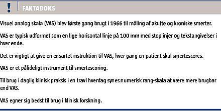 Når anvendelsen af VAS implementeres bredt i Danmark, synes det væsentligt, at metoden er valideret til formålet. Validering af VAS kan foretages på flere måder, f.eks. ved at sammenligne med andre målemetoder eller sammenholde VAS-værdierne med patienternes behov for analgetika. I mange studier af postoperative smerter har man anvendt flere samtidige målemetoder, f.eks. VAS og VRS, og fundet, at begge skalaer var pålidelige, præcise, simple og patientvenlige [3]. I de fleste studier af postoperative smerter har man rapporteret om både analgetikaforbrug og smerter angivet ved VAS, men en korrelation mellem de to parametre har vi ikke kunnet finde. I flere studier har man dokumenteret validiteten af VAS ved at evaluere, om den kunne bruges, og om den var korrekt. I studierne har man sammenholdt VAS med andre måleredskaber, primært NRS og VRS, og søgt forskelle i afkrydsningen af smerteintensitet ved smertefulde stimuli. Konklusionen har været, at VAS er et validt og pålideligt instrument til smertescoring. I et studie har man påvist, at VAS, VRS og NRS korrelerede signifikant. Desuden var det muligt at se selv små ændringer i smertegraden på alle tre skalaer [7, 13, 17].