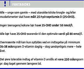 Nyere forskning tyder dog på, at en række alvorlige sygdomme forebygges ved at hæve 25-OHD til ca. 80 nmol/l. Trods langvarig fokus på vitamin D er der ikke ændret i anbefalingerne for indtag af vitamin D, og de gældende er end ikke nok til at sikre værdier > 50 nmol/l. Hvis man ønsker at opnå den optimale koncentration > 80 nmol/l, estimerer vi, at 50-70 mikrogram vitamin D pr. dag til alle over ti år vil være nødvendigt. Indtil sikkerheden af denne dosis er dokumenteret, anbefaler vi 35-38 mikrogram/dag.