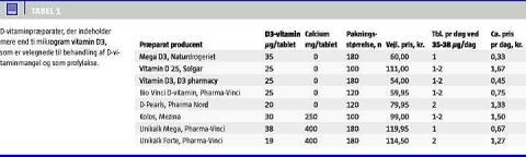 I Tabel 1 vises et udsnit af de D-vitaminpræparater på markedet, der indeholder mere end 10 mikrogram pr. tablet. Med de valgte præparater kan man ved indtagelse af 1-2 tabletter pr. dag få ca. 35-38 mikrogram D-vitamin. Øgningen af calciumindtag som kostberigelse eller tilskud hos raske med normalt calciumindtag øger ikke knoglemineraltætheden, hvorfor præparater med lavt calciumindhold må foretrækkes. Hos personer med usund kostindtagelse samt ældre og plejehjemsbeboere, som ikke får tilstrækkeligt calcium gennem kosten, må der behandles med supplerende calciumtilskud sammen med vitamin D. Ergocalciferol (D2) bør erstattes af cholecalciferol (D3), da D2-vitaminets effekt er mindre bl.a. på grund af en undertrykkelse af 25-OH-D3 og den aktive 1,25(OH)2 D3 [39]. Endvidere er der usikkerhed ved analyserne af vitamin D2 i blodet, da ikke alle analysemetoder for 25-OH-D3 medmåler 25-OH-D2.