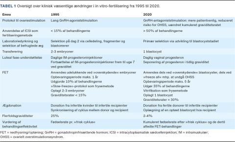 Som nævnt er den grundlæggende metode uændret, men IVF har udviklet sig i takt med såvel ny klinisk, farmakologisk og laboratoriemæssig viden som lovgivning. I Tabel 1 gives en oversigt over de væsentligste ændringer i behandlingspraksis. En af de mest markante udviklinger har været reduktionen i flerfoldsgraviditeter ved transferering af en enkelt blastocyst nu – ofte i en FET-behandling. Denne udvikling beskrives nærmere nedenfor.