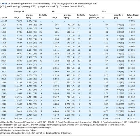 I Tabel 2 gives en oversigt over det årlige antal behandlinger, graviditetsraterne og flerfoldsgraviditeterne efter assisteret reproduktionsteknik dvs. IVF/ICSI, FET og ED. I alt er der frem til 2020 udført 342.000 behandlinger, og i 2019 udførtes der 21.948. Det er endvidere bemærkelsesværdigt, at antallet af FET-behandlinger er 15-doblet fra starten til nu. Graviditetsraterne efter IVF/ICSI kulminerede i perioden 2000-2010 (ca. 25% pr. behandling), for derefter at falde til omkring 20%, væsentligst pga. reduktionen i antallet af tilbagelagte embryoner. Omvendt er graviditetsraterne efter FET mere end fordoblet til nu 30% pr. behandling, og den kumulerede graviditetsrate pr. stimulationsbehandling er øget til 35% (Tabel 2).