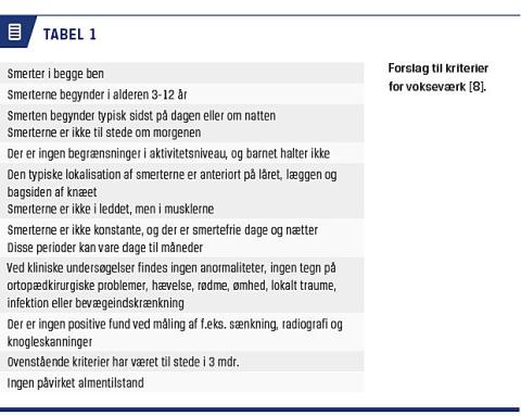 beskriver typisk, at smerten sidder i begge ben, oftest foran på låret, i læggen eller bag på knæet og er værst om natten. Der kan forekomme perioder uden smerte, og tilstanden har tit stået på i mere end tre måneder. Barnet har ingen begrænsninger i fysisk udfoldelse, og ved den objektive undersøgelse er der ikke nogen positive fund [9].