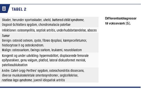 Hvis der hersker tvivl om diagnosen, kan en grundig objektiv undersøgelse afsløre bagvedliggende årsager til smerter, som f.eks. kontusion, distortion eller fraktur, juvenil idiopatisk artritis eller infektioner i led eller bindevæv. Hvis barnet har såkaldte røde flag i form af halten, eller smerterne er ensidige, kraftige og/eller primært relateret til et led samt hovedsageligt til stede i dagtiden, vil der være behov for at udrede barnet for andre lidelser. Det kan blive nødvendigt med billeddiagnostiske og parakliniske undersøgelser for at udelukke tumor, fraktur, hæmatologiske og reumatiske lidelser. En række relevante, men ikke udtømmende, differentialdiagnoser er foreslået af Mohanta (Tabel 2) [5].