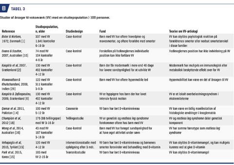 I Tabel 3 er epidemiologiske studier, der adresserer ætiologien bag vokseværk, præsenteret. Studierne er fundet ved en systematisk søgning i PubMed og EMBASE efter studier med en studiepopulation på > 100 børn, og i det følgende vil fundene blive beskrevet.