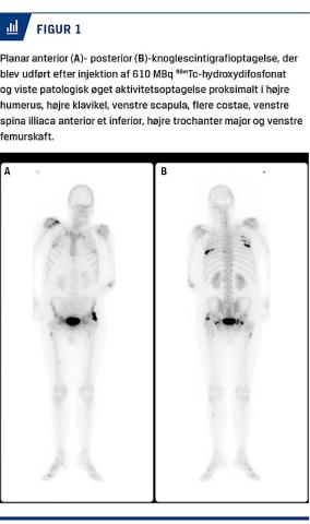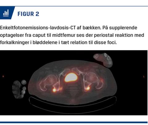 På mistanke om voriconazolinduceret periostitis blev der lavet helkropsknoglescintigrafi, som viste multiple, asymmetrisk fordelte foci med patologisk øget knoglemetabolisme i store dele af skelettet med involvering af de proksimale dele af adskillige lange rørknogler og costae (Figur 1). Ved supplerende enkeltfotonemissions-lavdosis-CT sås der i relation til disse foci periostal reaktion med forkalkninger i bløddelene i tæt relation til knoglerne (Figur 2). Det scintigrafiske billede var således foreneligt med periostitis.
