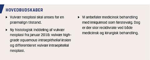 anbefaler som førstevalg medicinsk behandling med imiquimod for at undgå mutilerende indgreb. Immunsupprimerede patienter med VIN skal have særlig opmærksomhed. HPV-vaccine kan tilbydes patienter med vulvær HSIL. Vi anbefaler individualiseret opfølgning og gerne oplæring i egenomsorg og -kontrol, når sygdommen er velbehandlet.