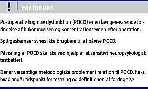 En neuropsykologisk test, der udføres nogle måneder postoperativt, må forventes at give mere pålidelige informationer om eventuel langvarig kognitiv svækkelse, men herved kan man måske forpasse chancen for at verificere en forbigående POCD, idet den kognitive funktion synes at bedres med tiden [9, 10]. Et andet problem er, at der i de postoperative måneder kan tilkomme cerebral sygdom såsom apopleksi.