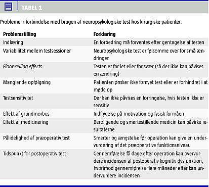 Der er talrige problemer forbundet med vurdering af, om den kognitive funktion forringes postoperativt, og der findes ikke egnede spørgeskemaer. Neuropsykologisk testning er derfor nødvendig, men der er ikke enighed om hverken valg af testbatteri, tidspunktet for testningen eller definitionen af en signifikant forringelse. Disse forhold bør haves in mente ved planlægning af videnskabelige undersøgelser og ved læsning af litteratur på området.