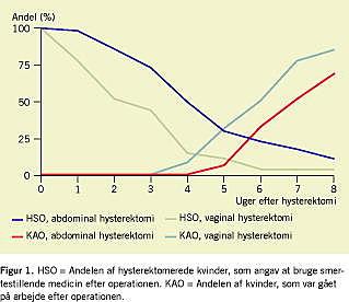 Enoghalvfjerds kvinder indgik i undersøgelsen. Heraf havde 27 fået foretaget vaginal hysterektomi, og 44 havde fået foretaget abdominal hysterektomi (Tabel 2 ). Svarene fra kvinder, der havde fået foretaget vaginal og abdominal hysterektomi afbildes af anskuelighedsgrunde i samme figur, men som anført kan der ikke drages sammenligninger mellem operationsmetoderne. Efter tre uger var kvalme og utilpashed ikke et problem hos 95% af kvinderne, mens daglige gøremål på det tidspunkt kunne klares af hhv. 75% og 99% af de vaginalt og abdominalt opererede. Samtidig brugte ca. 45% fortsat smertestillende medicin (Figur 1).