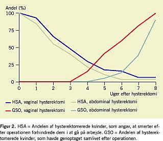 Under halvdelen havde genoptaget arbejdet en uge efter den af afdelingen anbefalede rekreationsperiode (Figur 1), derimod angav kun hhv. 10% og 20% af de vaginalt og abdominalt opererede kvinder at have smerter (Figur 2), og hhv. 20% og 10% angav, at træthed forhindrede dem i at gå på arbejde. Daglige gøremål kunne klares af næsten alle hhv. allerede tre og fire uger efter vaginal og abdominal hysterektomi. Fritidsaktiviteter var genoptaget af 75% ved rekreationsperiodens afslutning, og en uge efter den anbefalede rekreationsperiode havde halvdelen af de seksuelt aktive kvinder endnu ikke genoptaget samlivet i normalt omfang (Figur 2). Mindre end 90% genoptager samlivet på det tidspunkt, hvor det anbefales.