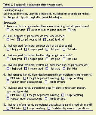Materiale og metoder: I perioden fra juli 2005 til juni 2006 indgik alle afdelingens hysterektomerede kvinder i et dagbogsprojekt, såfremt de opfyldte følgende kriterier: Operationen var indikeret af meno-metroragi, dysplasi, tryksymptomer eller smerter, kvinden var under 60 år, dansktalende og i fast arbejde. Rekreationsanbefalingerne fra afdelingens side var fire uger ved vaginal og seks uger ved abdominal hysterektomi. Kvinderne udfyldte postoperativt en gang om ugen et spørgeskema med otte spørgsmål om deres velbefindende og aktivitetsniveau.