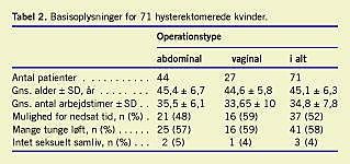 Resultater: Enoghalvfjerds kvinder indgik i analysen. Under halvdelen af kvinderne var begyndt at arbejde en uge efter den anbefalede rekreationsperiode. To tredjedele havde genoptaget fritidsaktiviteter, mens knap halvdelen af de seksuelt aktive kvinder havde genoptaget samlivet som før operationen.