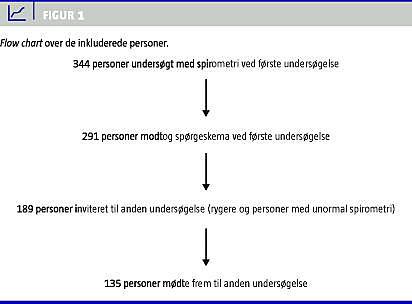 Materiale og metode: I alt 344 personer i Århus og omegn tog imod et anonymt tilbud om en gratis walk-in -spirometriundersøgelse i SundhedsCenter Århus, og 291 af disse udfyldte et spørgeskema. I alt 135 rygere og/eller personer med nedsat lungefunktion mødte frem til den anden undersøgelse med fornyet spirometrimåling og et uddybende spørgeskema. Personer med KOL blev stadieinddelt i henhold til retningslinjerne fra Global Initiative for Obstructive Lung Disease (GOLD).
