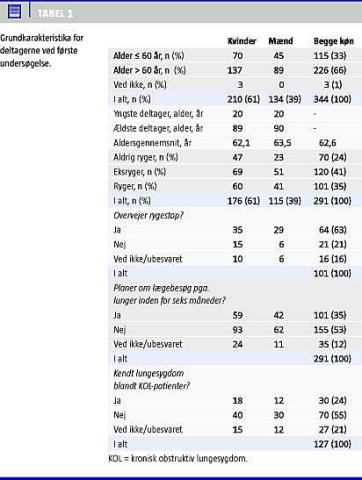 Resultater: 61% af de fremmødte var kvinder på 60 år og derover. 43% havde en normal lungefunktionsmåling ved første undersøgelse. Kun hver fjerde med KOL vidste i forvejen, at de var lungesyge. 33% af de fremmødte ville være gået til egen læge for at få lungerne undersøgt. Rygestopsfrekvensen mellem de to undersøgelser var 11-16%.