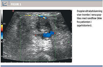 En 24-årig rask mand fik rødme og hævelse af højre ben og blev af en vagtlæge sat i behandling med penicillin-V på mistanke om erysipelas. Dagen efter opstod der forværring med smerter og hævelse af læggen, hvorfor han af egen læge blev henvist til et sygehus på mistanke om dyb venøs trombose (DVT). Der blev udført ultralydskanning af benets venesystem, hvor man konstaterede trombemasser i vena femoralis og vena poplitea (Figur 1). Patienten blev sat i behandling med heparin, lang kompressionsstrømpe og K-vitamin-antagonisten phenprocoumon, hvorved man opnåede international normaliseret ratio (INR) i det ønskede terapeutiske interval på 2-3.