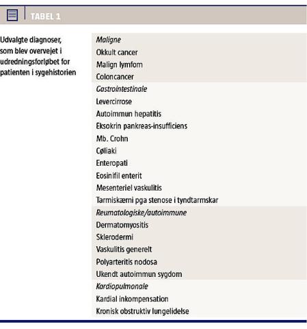 En 70-årig mand blev henvist fra egen læge til udredning for okkult cancer. Han var seks år forinden blevet udredt for en migrerende reumafaktornegativ artritis, og nu havde han vægttab, dyspnø og ødem-tendens. Dette skulle blive begyndelsen på et omfattende udredningsforløb, som kom til at strække sig over de næste 18 mdr., og hvor mange forskellige diagnoser blev overvejet og forkastet (Tabel 1). I løbet af perioden forværredes patientens almentilstand drastisk pga. hans fortsatte vægttab (i alt 30 kg), som til sidst nødvendiggjorde sondeernæring. Især gastrointestinale symptomer som obstipation, diarré, hepatomegali og ascites dominerede, men også kutane forandringer i form af fortykkede violette områder blev bemærket. På et tidspunkt blev der på vital indikation forsøgt højdosisprednisolonbehandling, hvorpå patienten viste bedringstegn. I samme periode var han dog i behandling med intravenøst (i.v.) givet cefotaxim for en mulig peritonitis, og ved en reumatologisk vurdering blev det efterfølgende dementeret, at der skulle være tale om en bindevævslidelse.