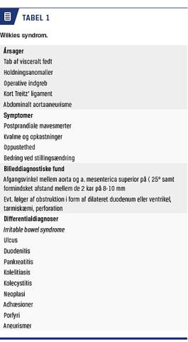 Wilkies syndrom er en sjælden tilstand med en prævalens på 0,01-0,3% og en overvægt hos unge kvinder [1]. Ved syndromet sker der en afklemning af duodenum som følge af en reduceret vinkel mellem aorta abdominalis og arteria mesenterica superior.
