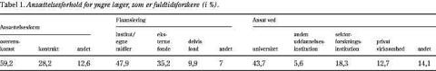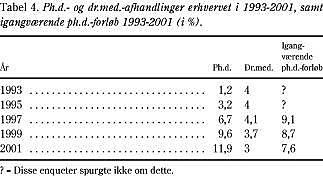 Samlet havde 12,0% af samtlige YL en ph.d.- eller licentiatgrad, og 3,0% havde en medicinsk doktorgrad, 7,0% var i et ph.d.-forløb (Tabel 3). I gruppen af YL, som stilede mod en karriere som fuldtidsforskere, havde 39,4% en ph.d.- eller licentiatgrad, 22,9% var i et ph.d.-forløb, og 9,9% havde en doktorgrad. Enqueten viser, at der blandt de yngste YL (ikkespeciallæger op til undervisningsstillingen) var flere, der var i ph.d.-forløb (9,3%), end blandt YL generelt (7,4%) (χ2 = 10,4; p < 0,001) og blandt YL, som var speciallæger (χ2 = 72,0; p < 0,001). Ved sammenligning af uddannelsesenqueterne 1993-2001 (Tabel 4 ) ses en stigning i andelen med en ph.d.-grad (χ2 = 33,4; p < 0,001), mens andelen med en doktorgrad er faldende (χ2 = 14,0; p < 0,001). I Tabel 4 ses også andelen af YL i ph.d.-forløb i perioden 1993-2001.