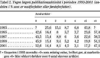 52,7% af YL svarede »ja« til spørgsmålet om, hvorvidt de forskede i fritiden, dvs. antagelig ulønnet forskning. 47,1% af YL svarede, at de havde publiceret mindst én gang som førsteforfatter. Af de YL, som forskede i fritiden, havde dette for 68,2% af tilfældene resulteret i minimum én publikation som førsteforfatter. I Tabel 2 ses den procentvise fordeling af YL på antal publicerede artikler fra uddannelsesenqueterne 1993-2001. Der ses i denne periode et generelt fald i antallet af YL med mindst én publikation som førsteforfatter, og alene siden 1999 er der blevet 7% færre (χ2 = 53,4; p < 0,001). Fra 1993 til 1995 skete der næsten en halvering af det forholdsvise antal YL me d > 5 artikler som førsteforfatter, og hvis man sammenligner 2001 med 1999 ses der et signifikant fald (χ2 = 12,3; p < 0,001). Det gennemsnitlige antal publicerede artikler som førsteforfatter er i perioden faldet fra 6,69/YL i 1993 til 2,48/YL i 2001 (t = -25,04, p < 0,001).