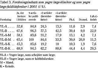 I Tabel 3 ses YL's forskningsindsats i form af artikler og afhandlinger, hvor YL inddeles i fuldtidsforskere og YL i klinisk arbejde. Når de to grupper sammenlignes ses det, at YL, som ville være fuldtidsforskere, ikke uventet forskede mere i fritiden, publicerede mere, og enten havde eller arbejdede på at få en videnskabelig grad. Der var tilsyneladende flere kvindelige fuldtidsforskere med > 5 artikler som førsteforfatter (80,8%) end mandlige (33,3%), men tallene er usikre på grund af et lille antal i denne gruppe (n = 71).