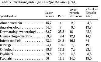 Der er stor forskel på YL's forskningsaktivitet inden for udvalgte specialer (Tabel 5 ). Der blev forsket og publiceret mest af YL inden for intern medicin, dermato-venerologi, onkologi og pædiatri. Inden for disse specialer var andelen af YL med en ph.d.-grad ligeledes højest. Specialerne almen medicin og psykiatri havde lavest forskningsaktivitet.