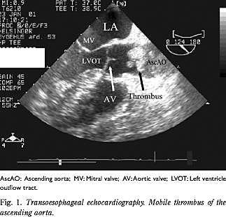 Patienten blev intuberet, og pga. de asymmetriske pulsforhold blev der foretaget TEE. Herved fandtes store, mobile trombemasser i aorta ascendens samt på overgangen mellem arcus aortae og aorta descendens, hvorfor man havde formodning om, at der var arterielle embolier til venstresidige ekstremiteter og cerebrum (Fig. 1 ).